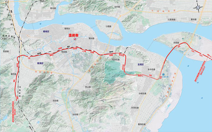 S1線一期工程:西起沿海鐵路溫州南站南端潘橋鎮(zhèn),向東北繞出至溫州西站,沿既有金溫鐵路通道至溫州東站,過溫州東站后線路折向西南沿龍灣區(qū)南洋大道、前房路至機(jī)場,在機(jī)場航站樓西側(cè)設(shè)機(jī)場站,出站后向北跨甌江南口至靈昆島折向東至一期工程終點甌采站。